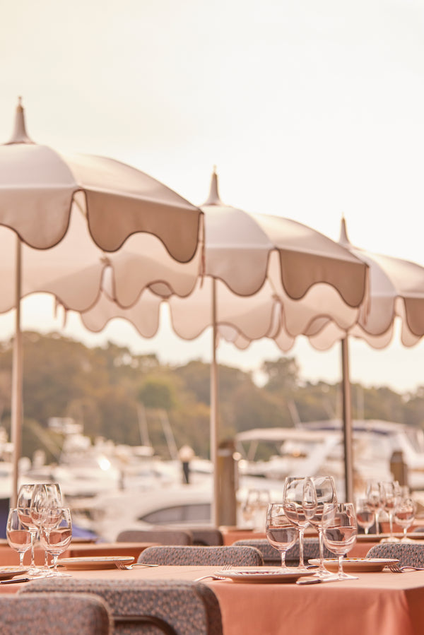 Image on right: Soleil Patio Umbrella in Ombre 'Terra' for Jimmy's, Merivale